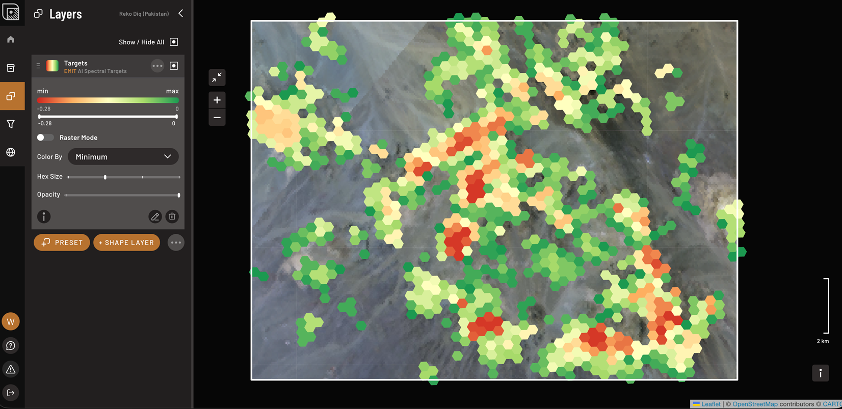 When you analyze a large area, individual pixels can obscure the whole story. Our new hexagon view groups pixels into an adjustable grid, allowing you to identify trends at different scales. You can enlarge or shrink hexagons by zooming and select how values combine—min or max—to match your question. At high zoom levels, map tiles are resampled. When you choose 'min' or 'max', we request tiles that honor that choice, so each hexagon reflects the underlying extremes as accurately as possible.