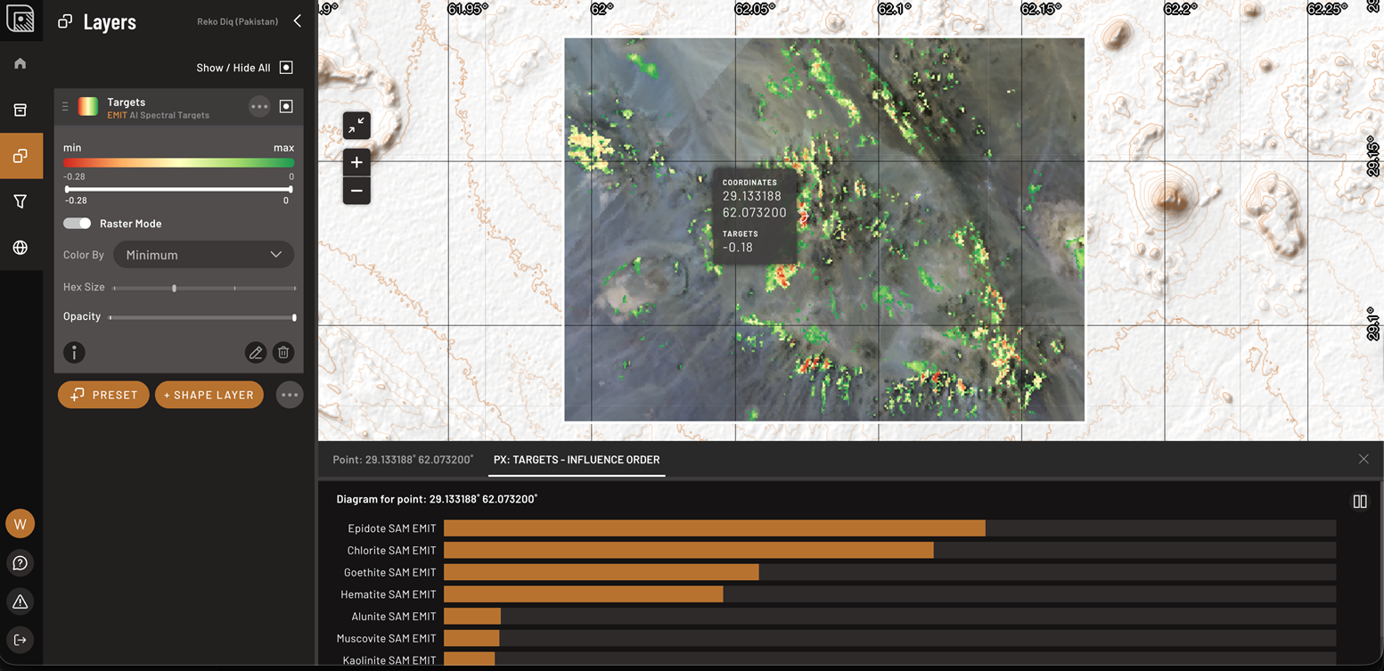 - Click any pixel to open the Target Influence Diagram and see which mineral-mapping layers contributed the most.