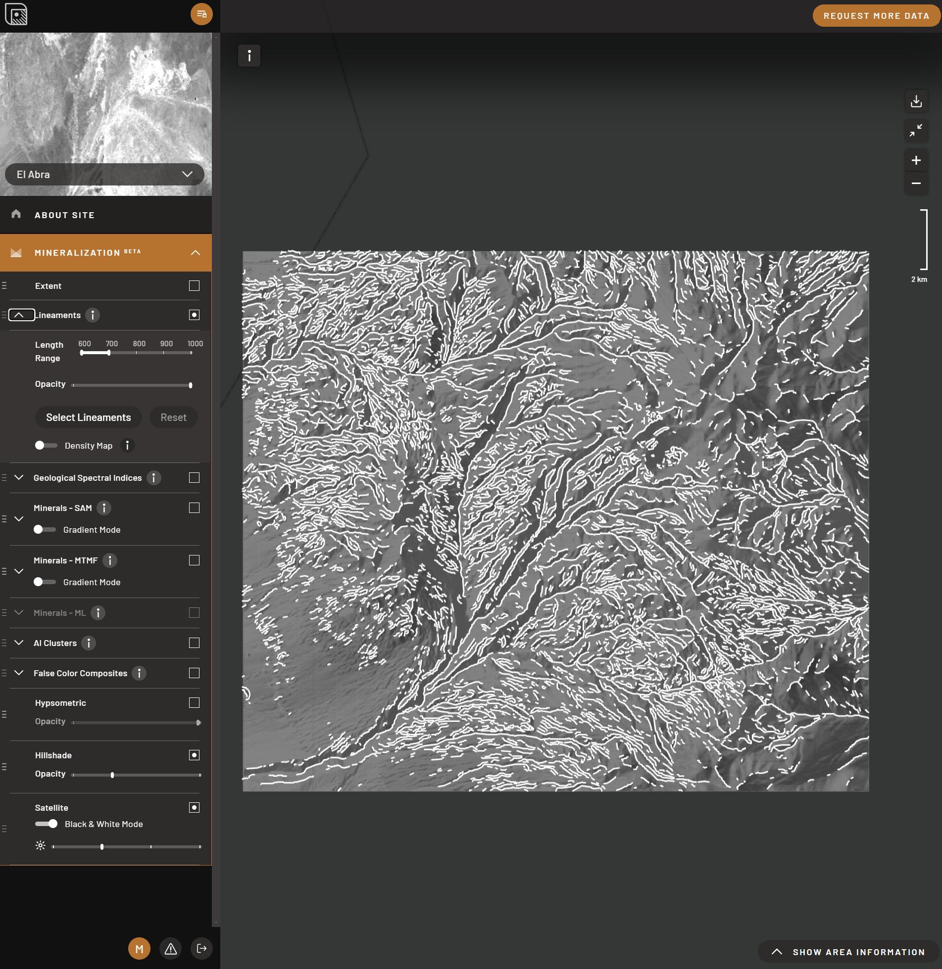 Spectral indices are key to TerraEye’s satellite-based mineral exploration capabilities. Spectral indices use specific wavelength combinations to highlight the presence of certain minerals or alteration zones, which are crucial in identifying potential mineral deposits. TerraEye’s platform uses AI to process these spectral indices and combine them with other data layers, such as FCC images and lineament maps, to deliver detailed and accurate mineral maps. The algorithms enable rapid analysis of vast areas, identifying regions with potential for further exploration by analyzing mineral spectral signatures. This capability ensures faster and more cost-efficient exploration compared to traditional methods.