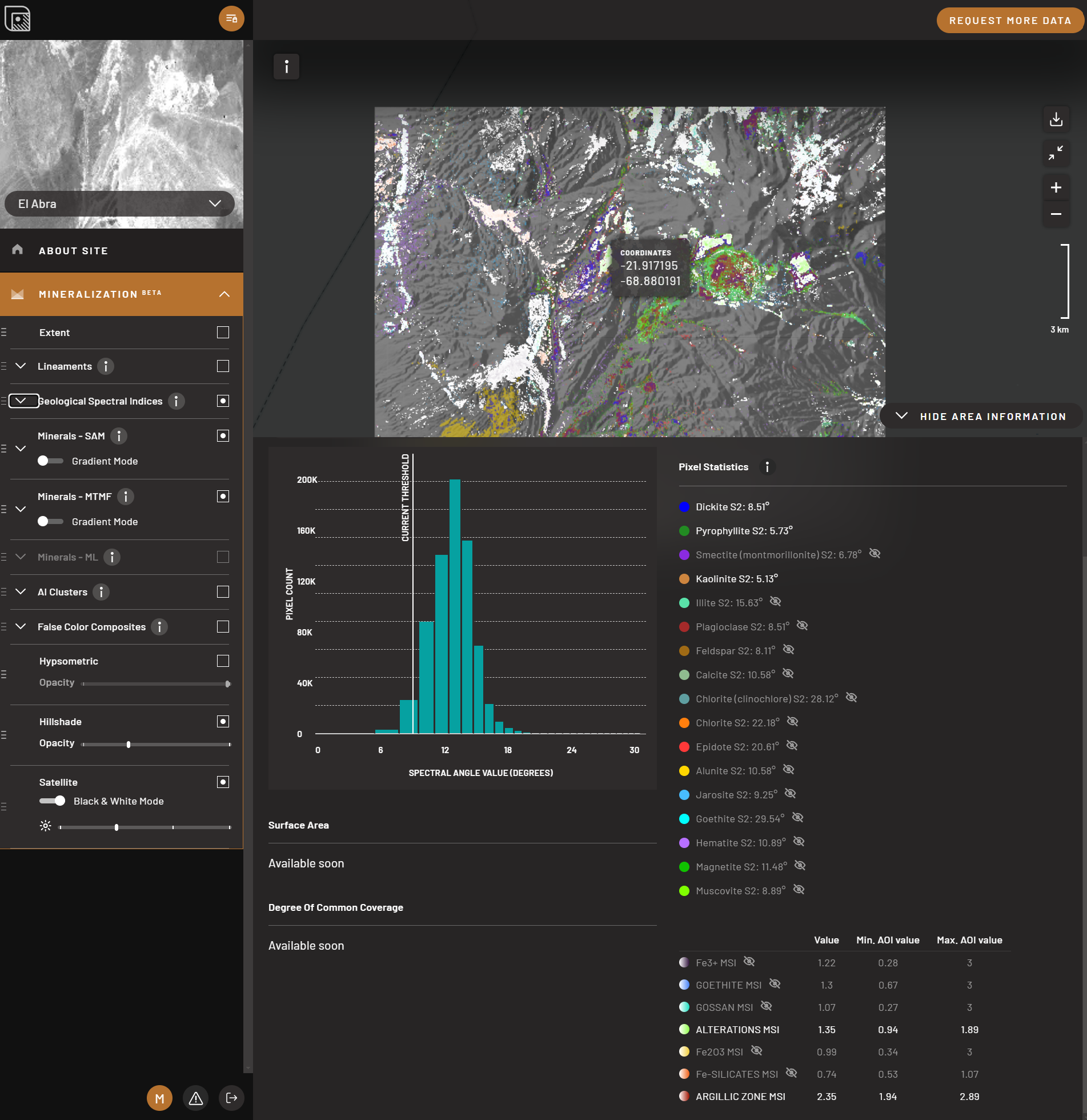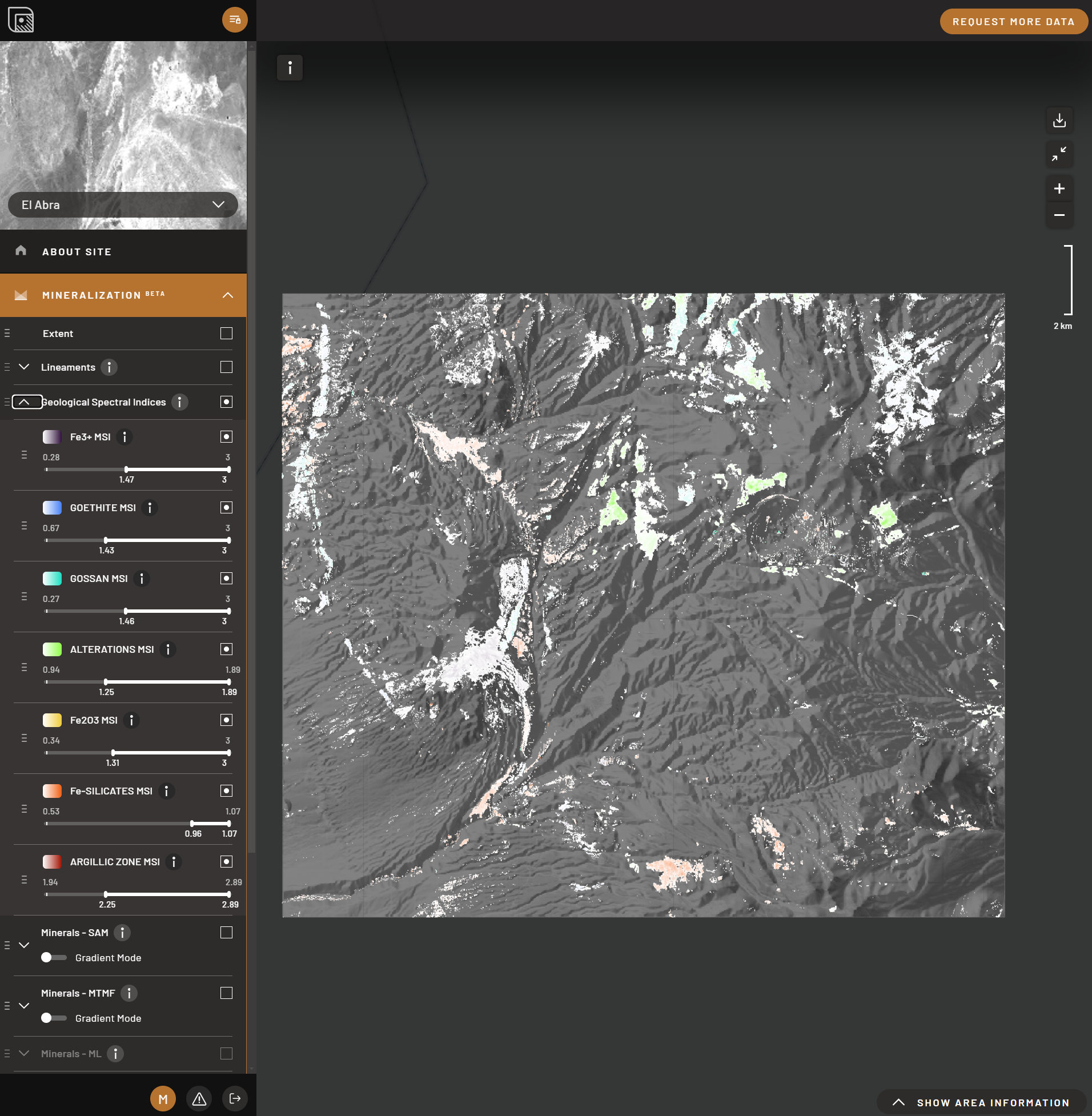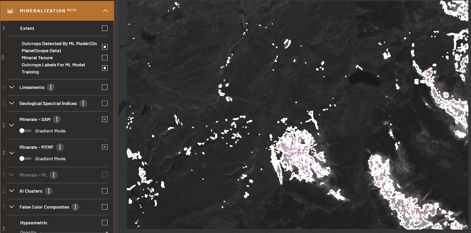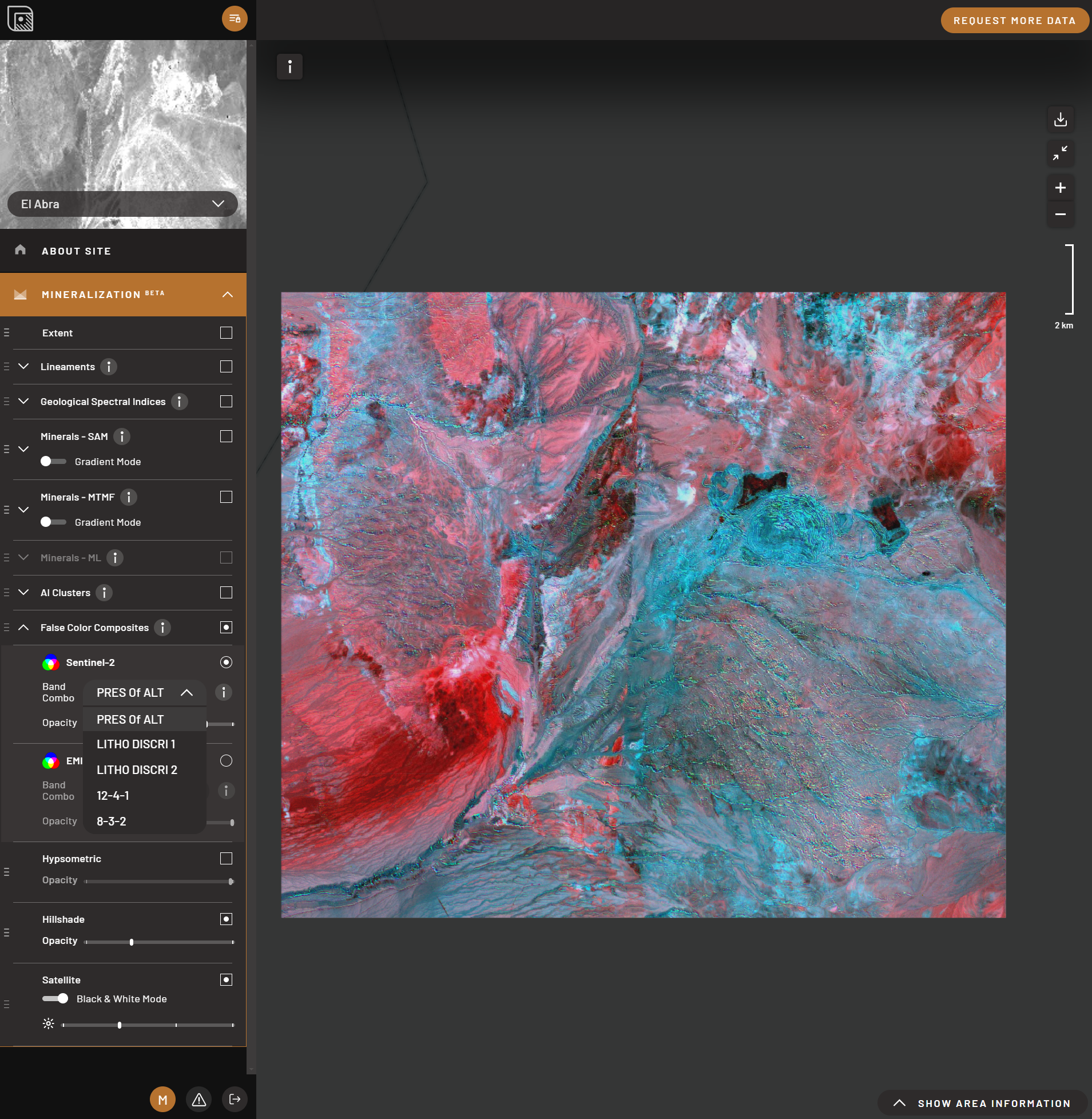 Another AI-enhanced feature within TerraEye’s platform is its use of False Color Composites (FCC). FCC images leverage spectral bands that are beyond the range of human vision to highlight geological features and mineralization zones. These images provide unique insights into rock types and surface features that are invisible in standard satellite imagery. TerraEye integrates AI with FCC analysis, allowing the platform to automatically interpret these images and identify mineral-rich areas with high precision. This process accelerates mineral discovery, helping to distinguish between different lithologies and quickly identify promising exploration targets.